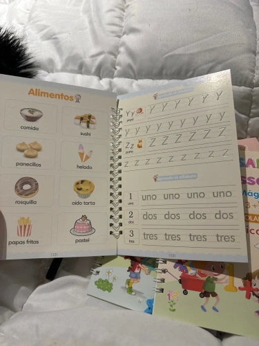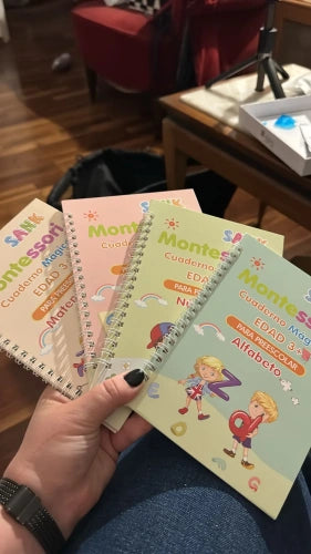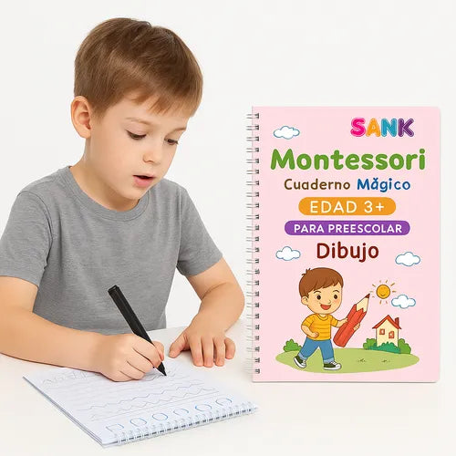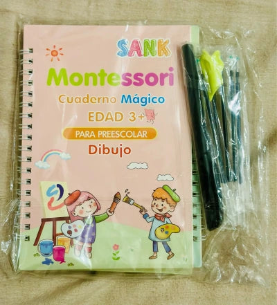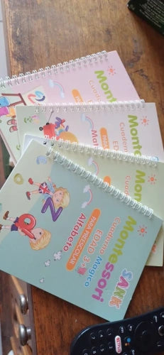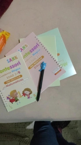 Incluye 4 cuadernos temáticos (letras, números, dibujos y caligrafía avanzada) + 1 lapicera mágica con 5 repuestos.